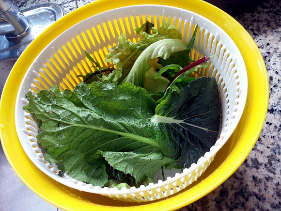 꽁다리를 자른 다양한 잎채소를 스피너에 넣고 뚜껑을 닫아 쓍쓍~ 돌려주세요.